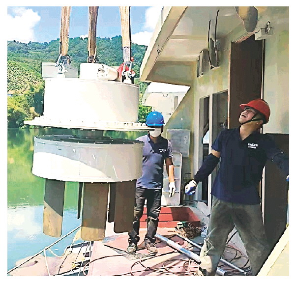 ◤工人正在吊装直翼推进器。五洲公司供图