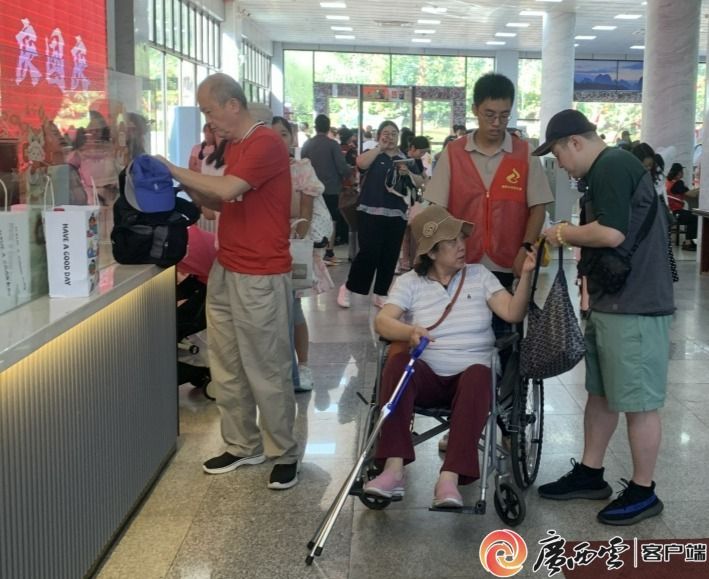 漓江磨盘山客运港,志愿者为腿脚不便的游客推行轮椅,贴心护送游客顺利登船。