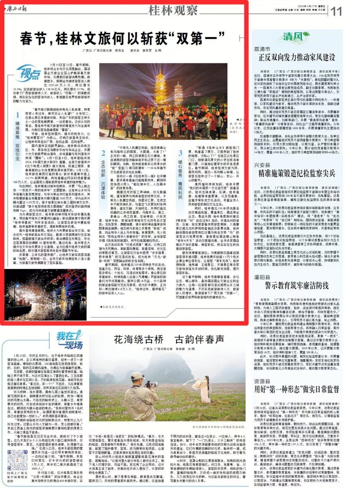 “春节前夕就刷到桂林有无人机表演,特意带家人来过年,果然没让人失望!”大年初二,在象山景区非遗旅圩前,来自广东的游客王琳女士一边欣赏桂剧展演,一边笑着说。这份认可的背后,是桂林节前文旅宣传的精准发力与全面布局,为假日客流高峰提前“蓄能”。