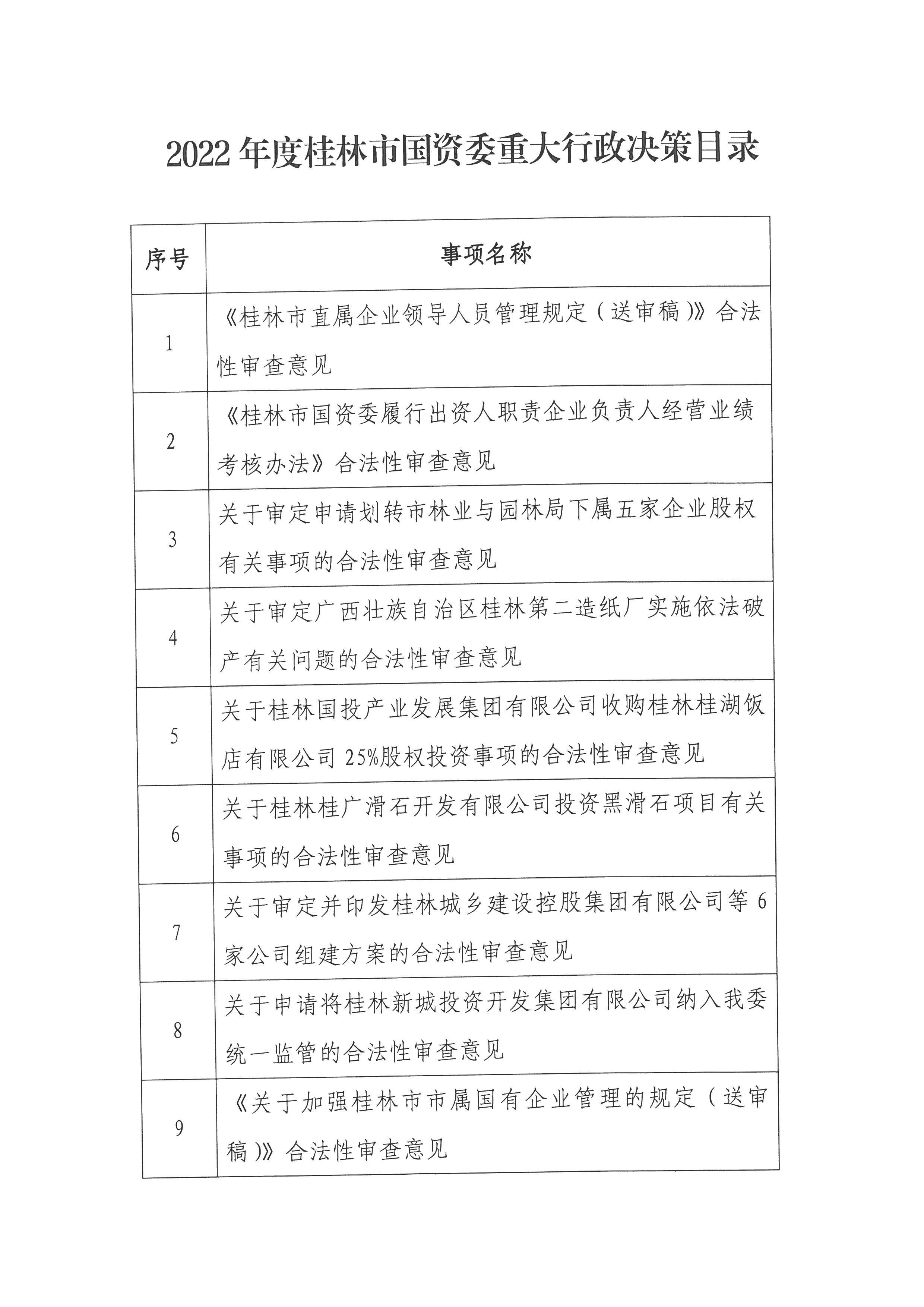 桂林市国资委2022年度重大行政决策目录